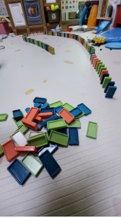 ドミノは毎回完璧に倒れます。電車はカーペットの上でも順調に進み、とても便利です 👍